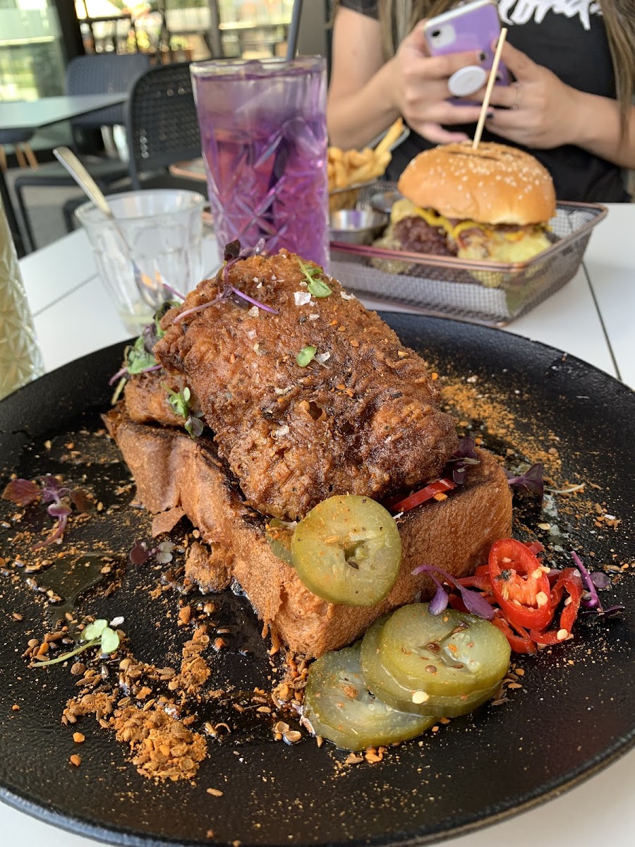 Been coming here for coffee but never tried the food. Finally given the opportunity, this is definitely a gem in Belmont. The French toast with fried chicken was an amazing portion. The sweetness of the bread paired with the spicy chicken gave it a perfect balance. The smashed beef burger again was a 10/10. Juicy, fresh made and is one of the best burgers I’ve had in Perth. Menu is slightly pricy, but worth it if you’re looking at enjoying good food at an amazing location. The library is next door so plan your breakfast, lunch, and drinks (alcoholic) around here.